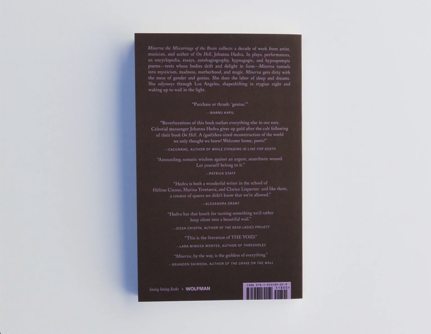 Minerva the Miscarriage of the Brain collects a decade of work from artist, musician, and author of On Hell, Johanna Hedva. In plays, performances, an encyclopedia, essays, autohagiography, hypnagogic, and hypnapompic poems—texts whose bodies drift and delight in form—Minerva tunnels into mysticism, madness, motherhood, and magic. Minerva gets dirty with the mess of gender and genius. She does the labor of sleep and dreams. She odysseys through Los Angeles, shapeshifting in stygian night and waking up to wail in the light.